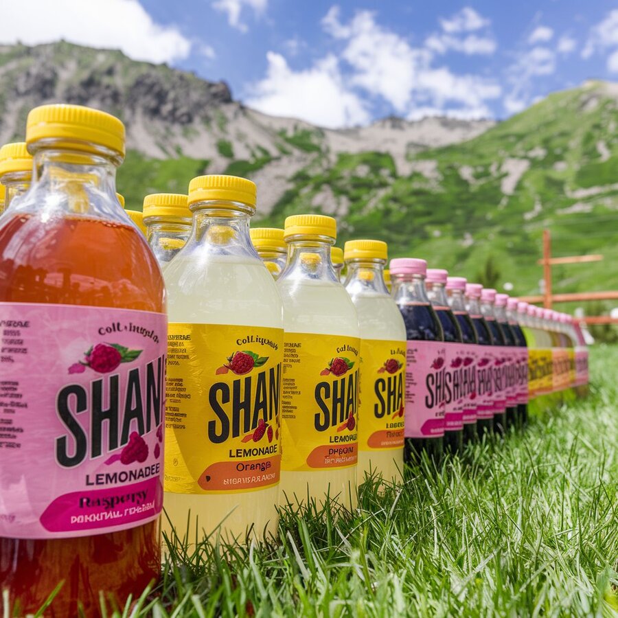 /imagine prompt: create a package of cold Ingush lemonade «SHAN». Looks like a glass bottle with natural lemonade in yellow shades, packages for different tastes. All bottles stand on the grass, against the backdrop of mountains and nature.