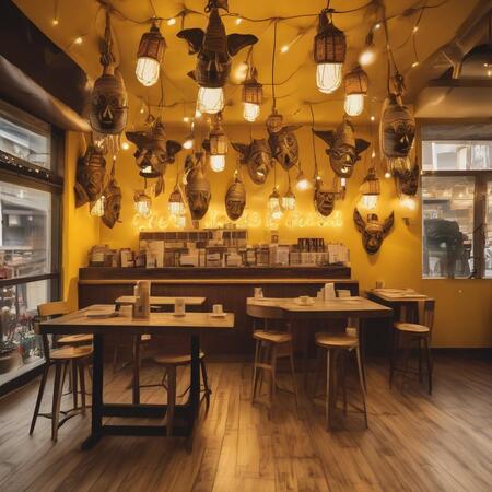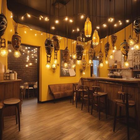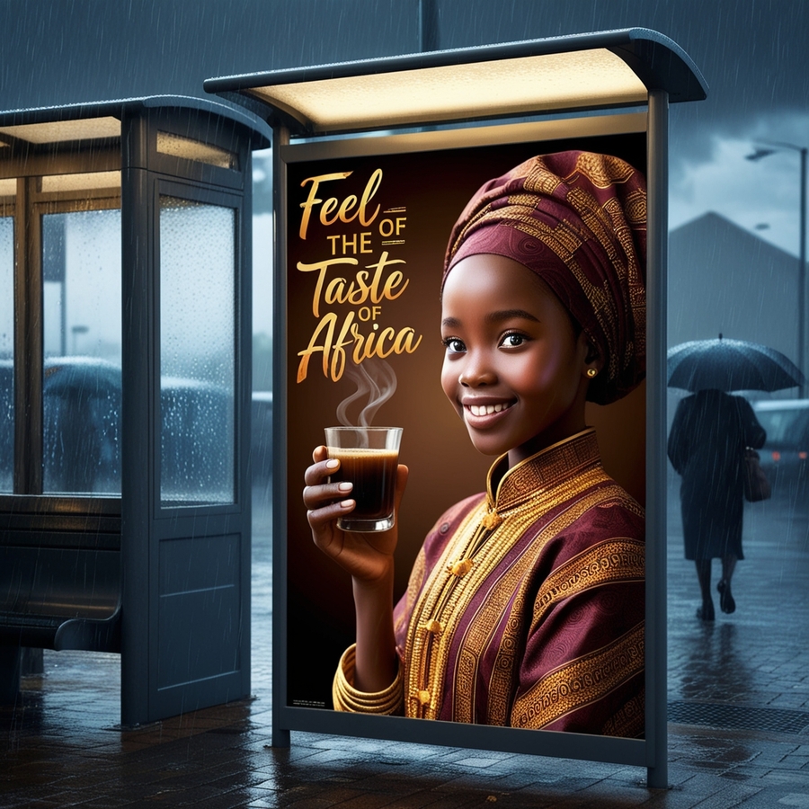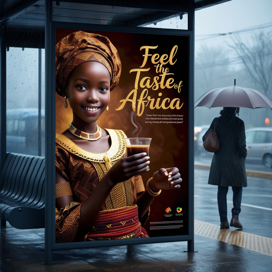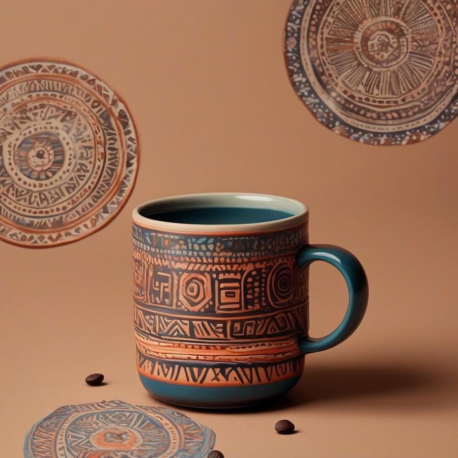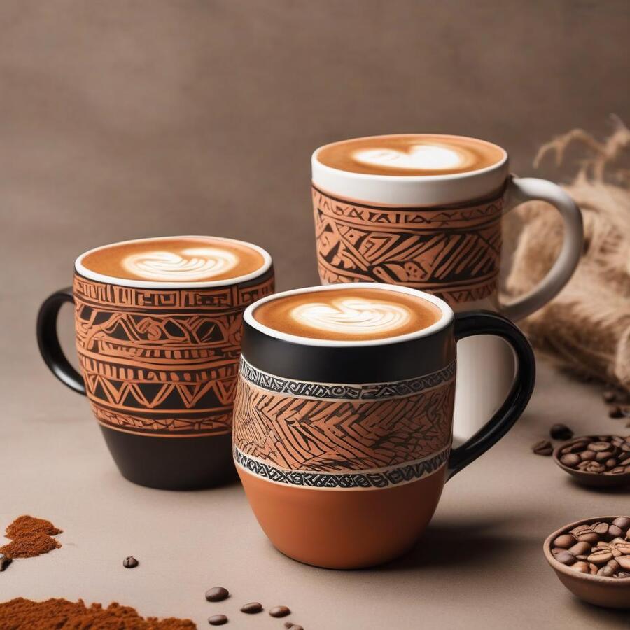 1. Terracotta ceramic mug with ethnic patterns, inside Americano coffee 2. Terracotta ceramic mug with ethnic patterns with Latte coffee and latte art on it 3. a photo of a Coffee shop, a general plan, garlands of incandescent lamps hang from the ceiling and shine with yellow light, a wooden floor, African masks hang on the walls 4. a photo of the poster at a bus stop on a rainy day, the poster shows a girl from Rwanda in a national costume with a glass of coffee and the inscription below: Feel the taste of Africa 5. vector logo for the coffeeship coffee shop in a minimalistic style with ethnic patterns in terracotta on a white background