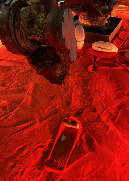 Существует детская игра под названием «Секретики». Суть игры заключается в закапывании в песок маленьких предметов, накрывании их стекляшкой, а затем засыпании песком. Таким образом, получается, что под покровом песка лежат нетронутые артефакты, которые впоследствии может найти человек, который их закопал, или кто-то другой. В моей работе их находит робот. Робот становится самостоятельным актором и играет с человеком в детскую игру, в которой человек создает в песке тайники и прячет там маленькие сокровища, а робот их находит и рассматривает. Робот бережно очищает песок со стекла и позволяет зрителю рассмотреть предметы, которые лежат под ним.