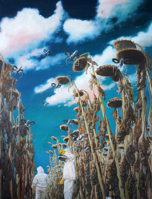 На выставке «Зона пчел» устройство жизни пчел рассматривается как образ современного общества: культурные и социальные модели человека находят прямую связь с миром этих насекомых. Кроме того, проект обращается к ближайшему будущему и предполагает его дистопические сценарии, связанные с непоправимыми экологическими изменениями. Эти линии переплетаются в работах Марии Сафроновой и Антона Кузнецова, которые отражают разные аспекты взаимодействия пчел и людей: тонкие связи, границы контакта и зависимость друг от друга. В серии «Рефугиум» Антон Кузнецов поднимает вопрос взаимоотношений человека, технологий и природы. Устраняя проблемы при помощи разных устройств, человек протезирует природную среду, однако технологии зачастую порождают новые трудности. В живописных работах и инсталляциях Кузнецова отображается гипотетическое будущее, в котором люди вынуждены заменить пчел механизмами: над тающими ледниками летают дроны, место естественных ульев заменяют фабричные цеха, а поля превращаются в искусственные установки по выращиванию растений.