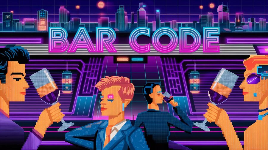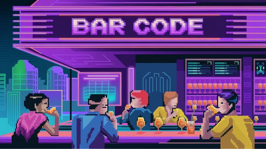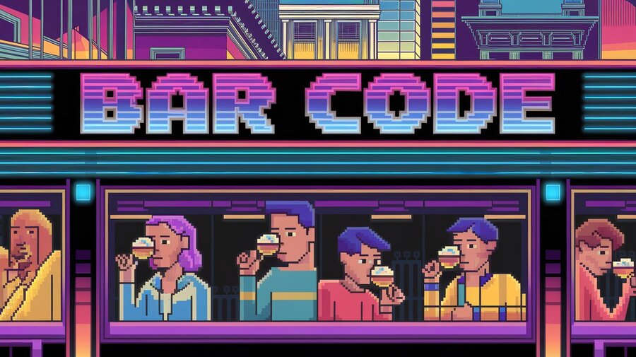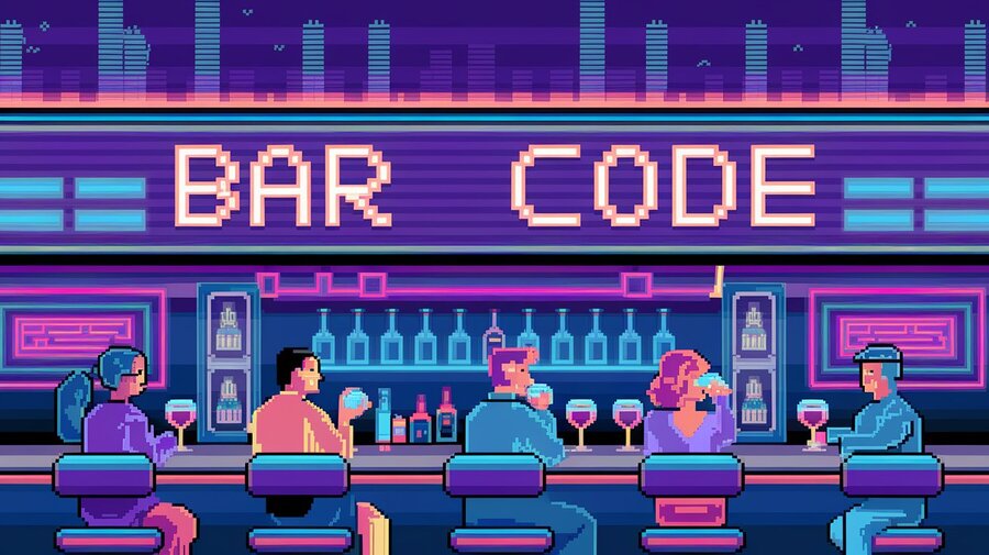 Prompt: retrofuturistic digital cyberpunk bar «BAR CODE», with hints of purple and blue hues, the overall design radiating a sense of nostalgia and tech-noir flair, people drinking from wine glasses made of pixels.