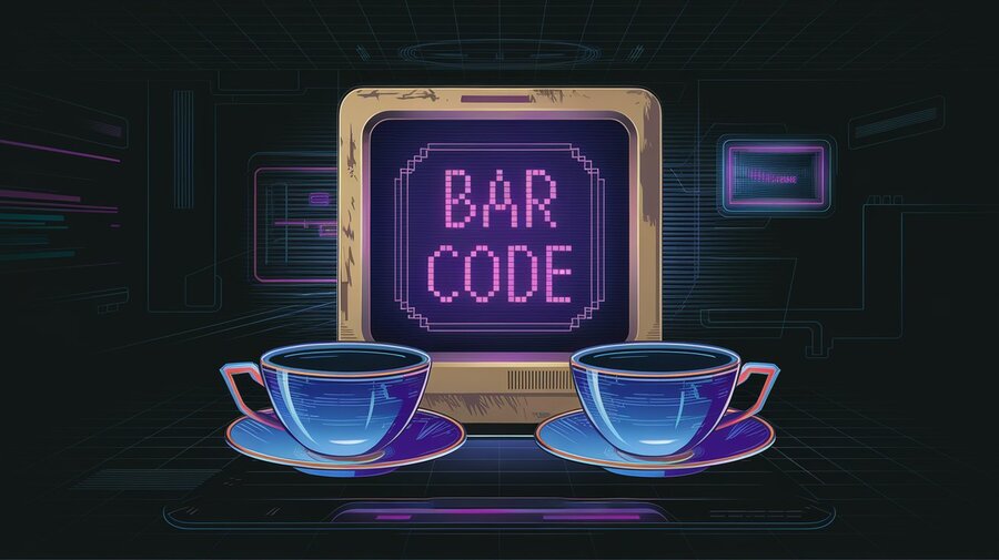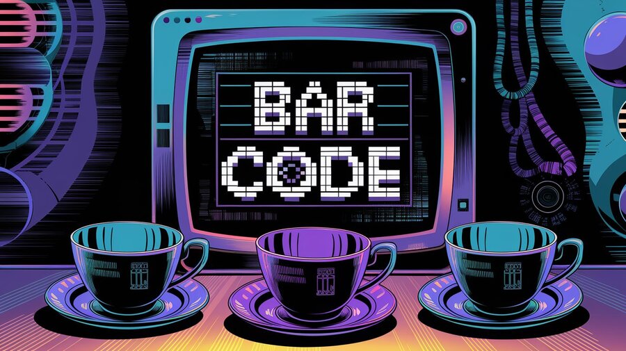Prompt: A digital illustration of a retrofuturistic cyberpunk bar called «BAR CODE». There are teacups with purple and blue hues on a table. The walls of the bar are made of glass, revealing a city with tall, neon-lit buildings. There is a vintage computer screen in the background with a worn texture. The overall design has a nostalgic and tech-noir flair.