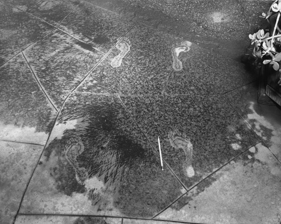 Первое изображение в книге — следы, оставленные на плитке, примерное понимание масштабов дает карандаш, лежащий рядом со следом.