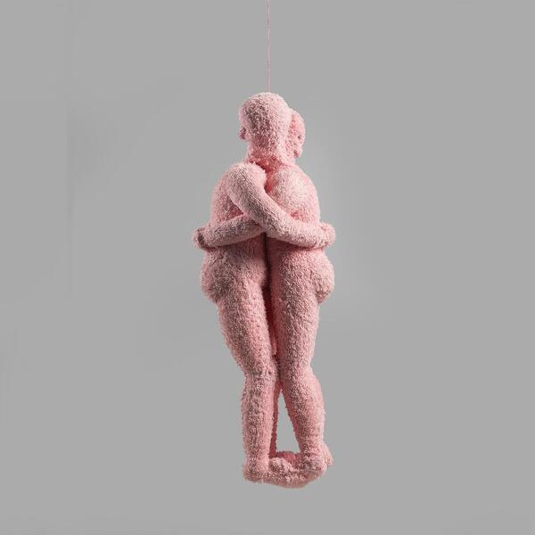 Текстильная версия, выполненная из розовой ткани, передает тактильное тепло и интимность. Органичность материала вызывает ассоциации с кожей, создавая ощущение телесного контакта. В противоположность этому алюминиевая версия представляет отношения как жесткую конструкцию: холодный металл образует монолитный кокон, лишенный человеческой мягкости, но сохраняющий ту же степень взаимопроникновения.