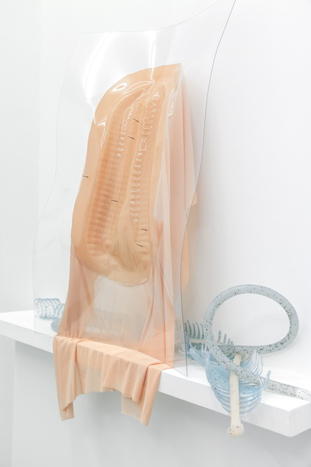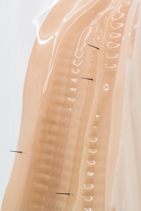 В отличие от предыдущего раздела, где тело выступало активным агентом — двигающимся, воздействующим, вступающим в контакт, — в данном контексте оно превращается в объект репрезентации и художественный материал. Представленные работы демонстрируют процесс своеобразного «пересобирания» телесности: художники конструируют тела заново, используя силикон, воск, текстиль и металл. Эти искусственные создания иллюзорно наделены жизнью, хотя фактически ее лишены. Данный парадокс — видимость присутствия при реальном отсутствии — и порождает феномен фантомной тактильности.