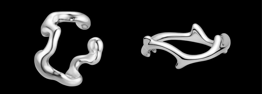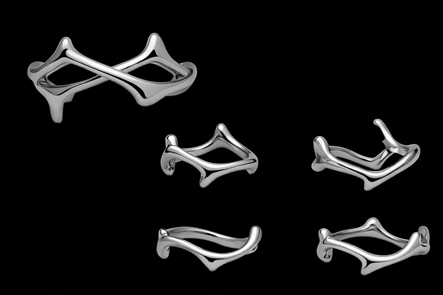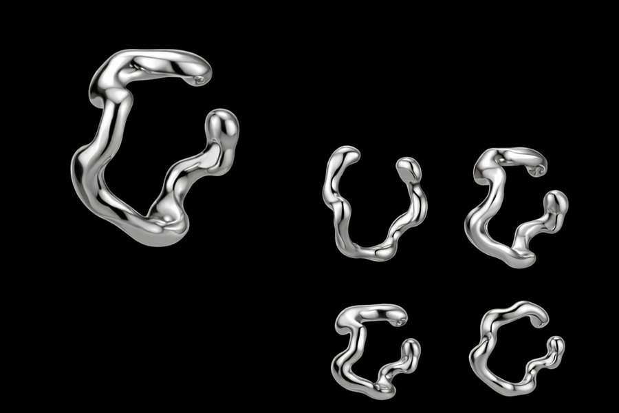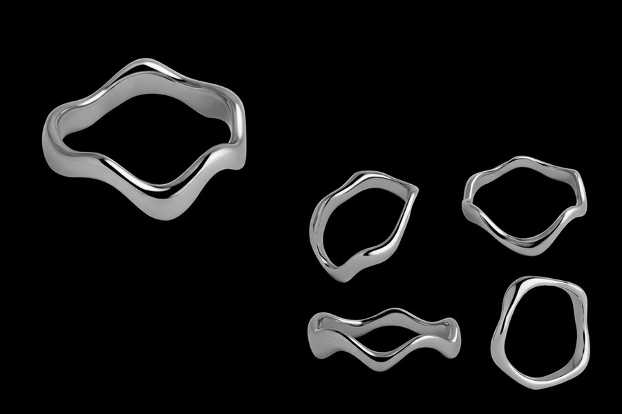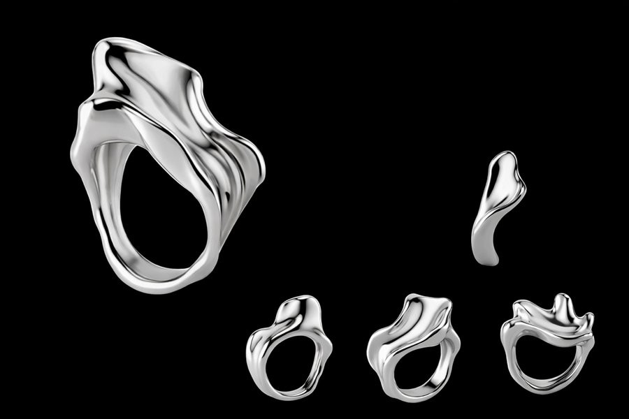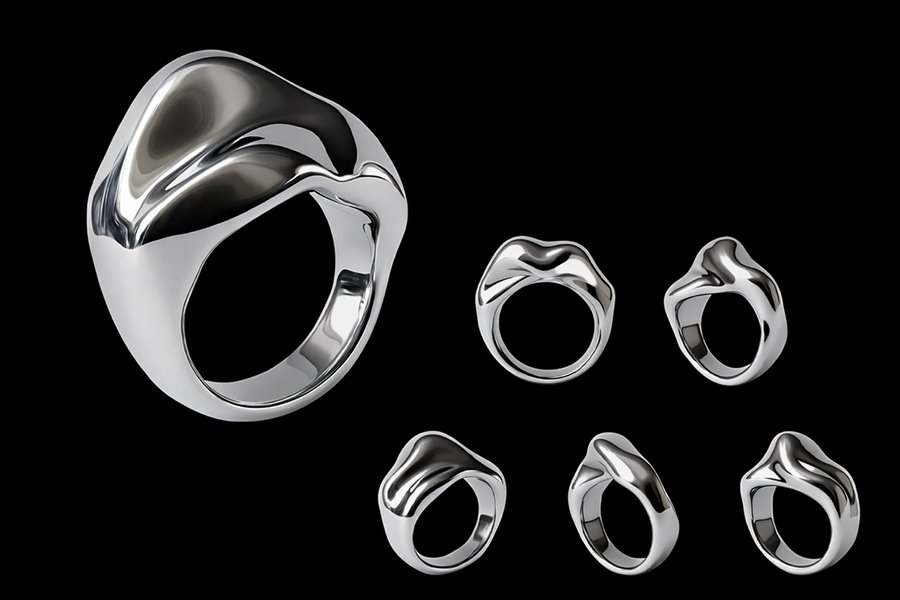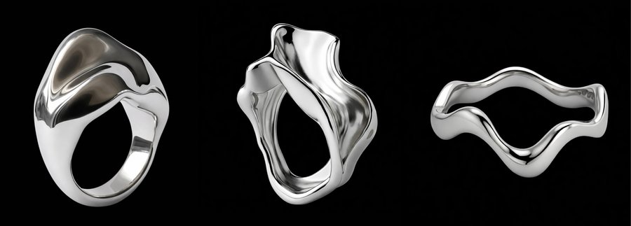 Каждое изделие передаёт эстетику «жидкого металла» — текучую, живую и непредсказуемую. Гладкие скульптурные поверхности и зеркальный блеск создают ощущение движения и игры света, превращая кольца в небольшие техно-артефакты, существующие на границе между цифровым алгоритмом и материальным объектом.