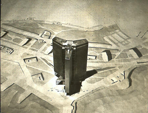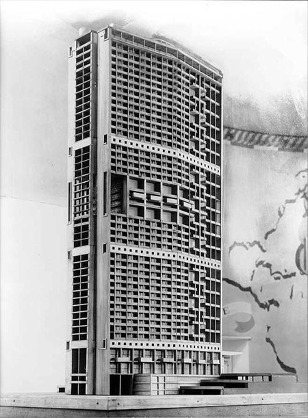 слева — проект небоскреба в Алжире (1942г), Ле Корбюзье, справа — кресло Votteler (1956г), Walter Knoll