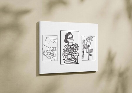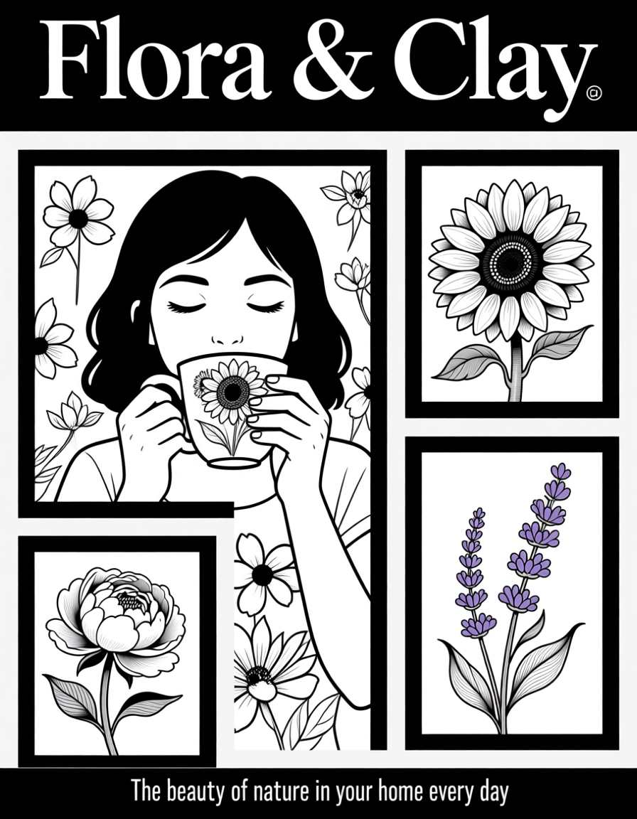 Промпт № 2: A promotional poster for the ceramic shop «Flora & Clay». The poster is divided into three panels, mimicking the composition of the third reference image. The central, largest panel shows a girl drinking from a cup decorated in detail with flowers. At the bottom is the caption «The beauty of nature in your home every day."The overall style is graphic and illustrative in black and white, with an emphasis on the interaction between human forms and nature, as can be seen from the examples provided.