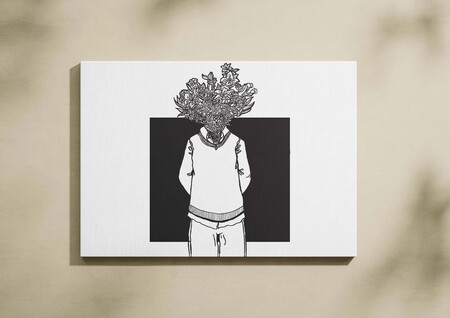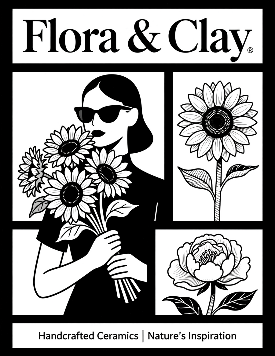 Промпт: The cover of a booklet for «Flora & Clay» ceramic shop. The design features a full-bleed, black-and-white illustration. A figure in a simple sweater stands with hands behind their back, their head completely replaced by an enormous, detailed bouquet of mixed flowers, identical in style to the first reference image. The background is solid black. The shop’s name, «Flora & Clay», is written in a clean, modern sans-serif font at the bottom, in white. The inside pages would feature the product shots and shop interior described above, all rendered in the same consistent, high-contrast, illustrative style.