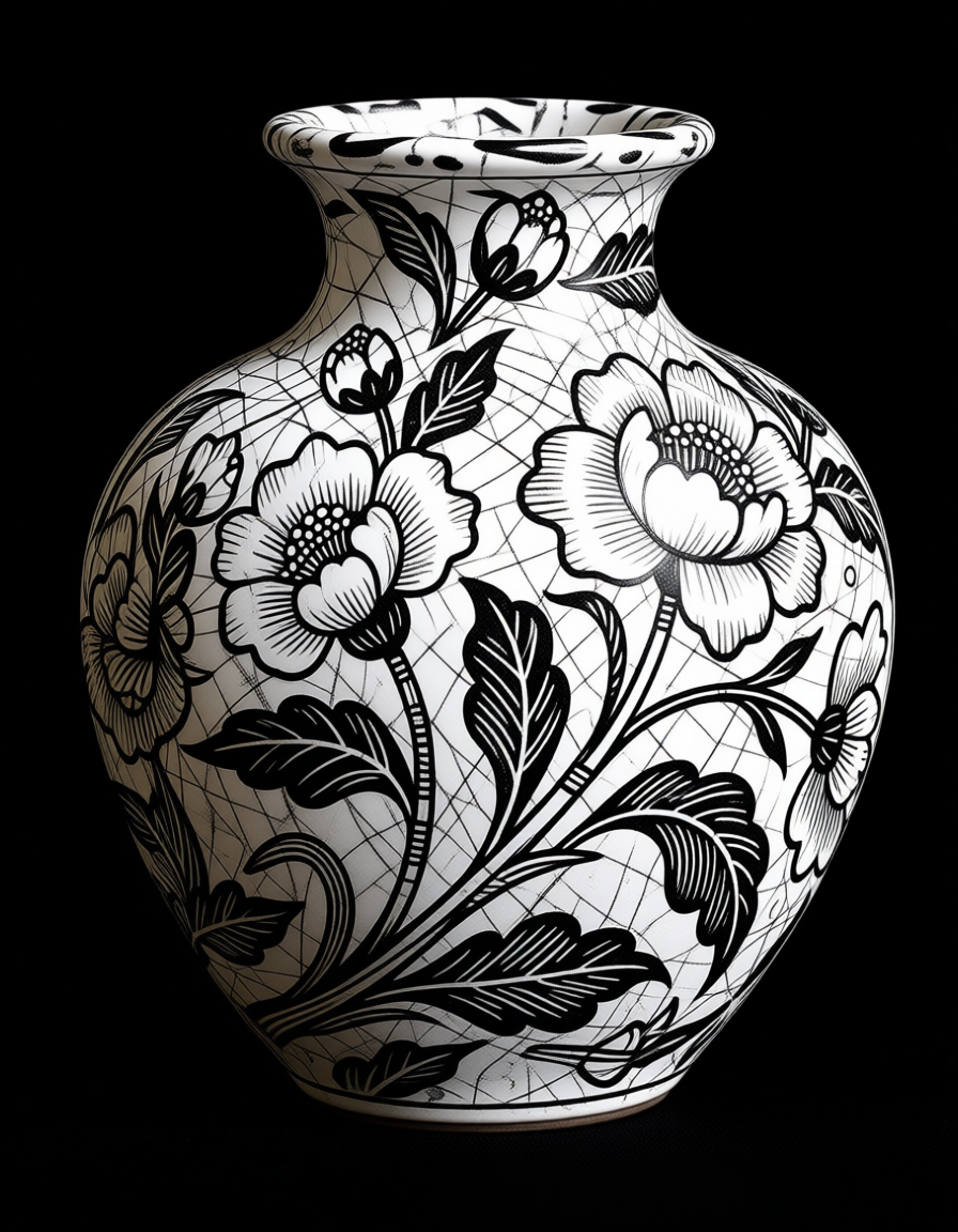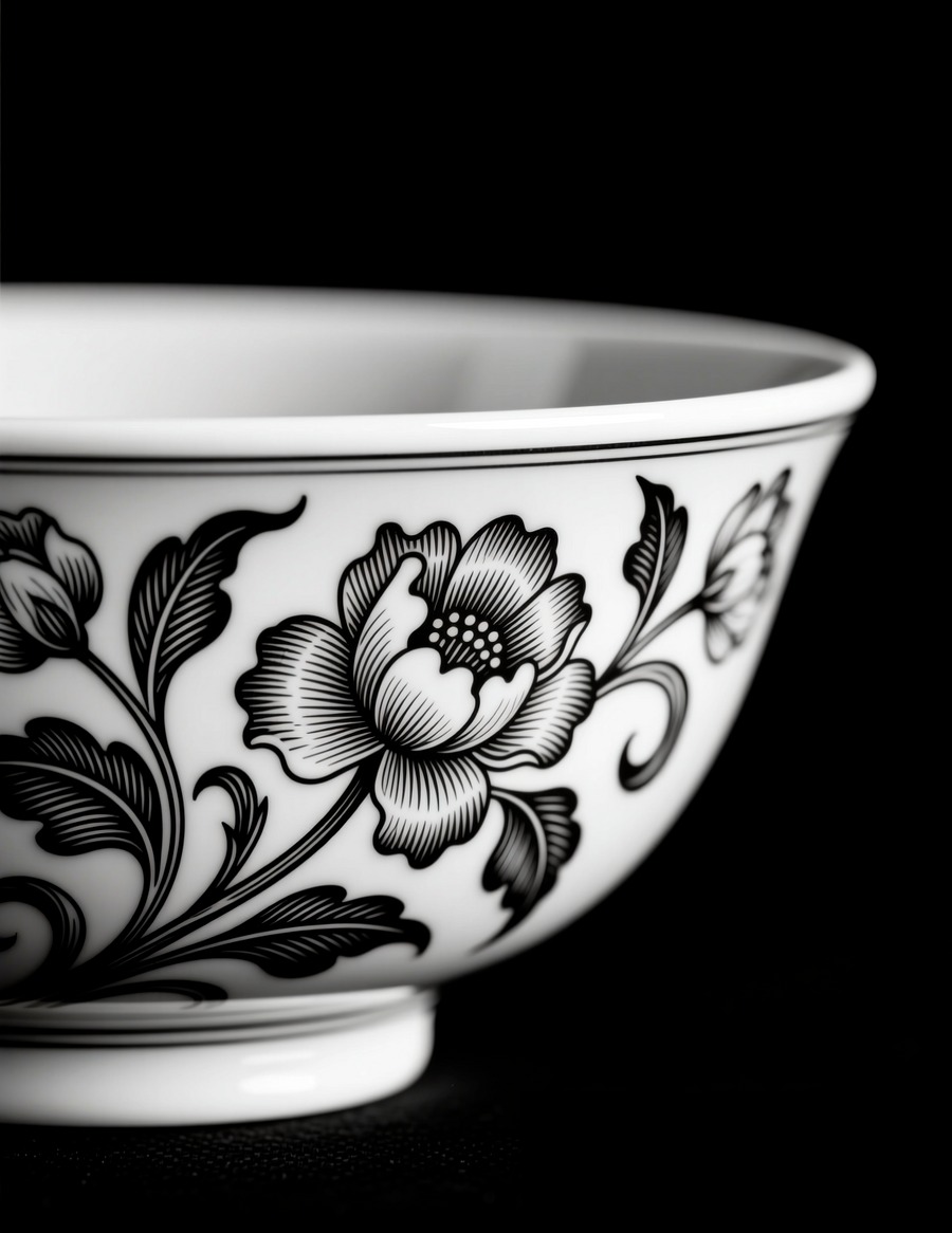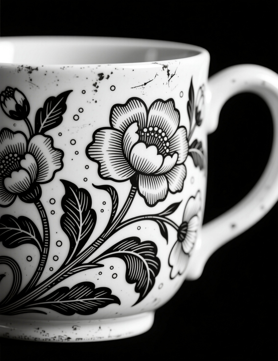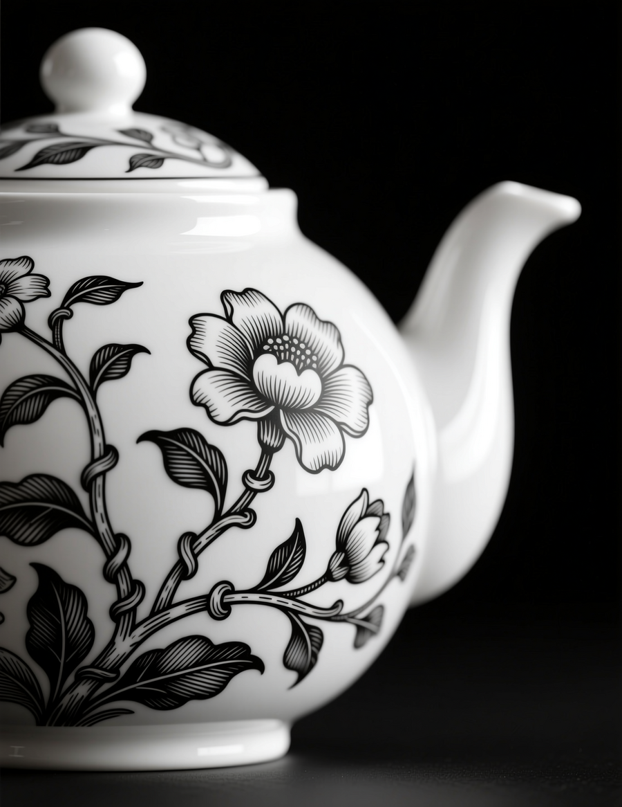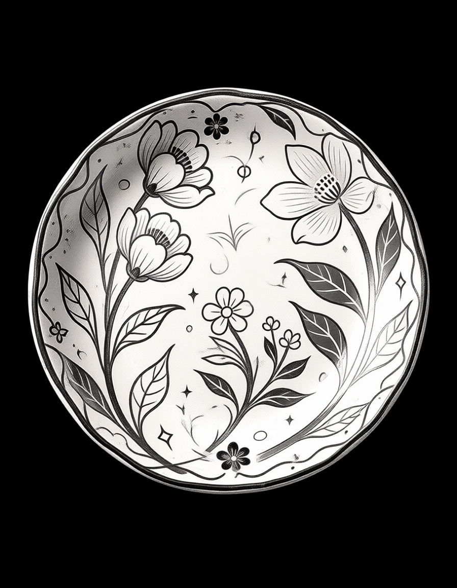 Сгенерировано с помощью нейросети Qwen. Промпт: A collection of handcrafted ceramic products arranged on a plain surface. The items include a teapot, a mug, a small bowl, and a decorative plate. Each piece is adorned with intricate, hand-drawn floral patterns that appear to be growing directly out of the clay, merging the object with the decoration. The illustration is done entirely in black and white, using bold, expressive lines and heavy cross-hatching for texture, mimicking the style of the provided reference images. The background is solid black, making the white ceramics and their detailed floral designs stand out dramatically.