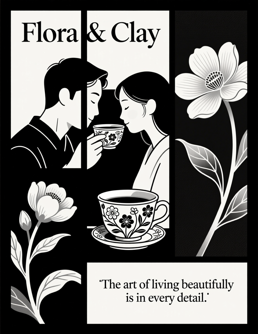 Промпт № 3: Advertising poster for the pottery shop «Flora & Clay». The poster is divided into three panels, repeating the composition of the third reference image. On the central, largest panel, a family couple is drinking from a service, decorated with flowers in detail. On the panel on the right, at the top, a close-up of one perfectly drawn flower is shown. On the panel on the left, at the bottom, another type of flower is shown in close-up. All elements are framed by a dense black border. The overall style is black and white, minimalist, graphic and illustrative, with a focus on the interaction between human forms and nature, as seen in the examples provided. At the bottom, the caption reads «The art of living beautifully is in every detail.»