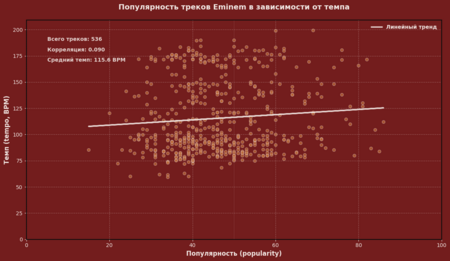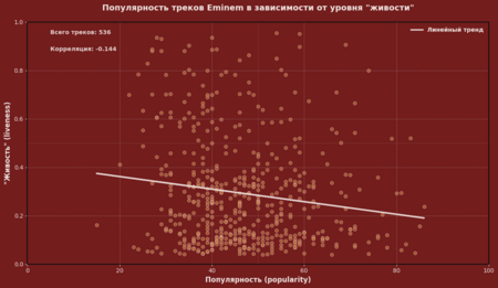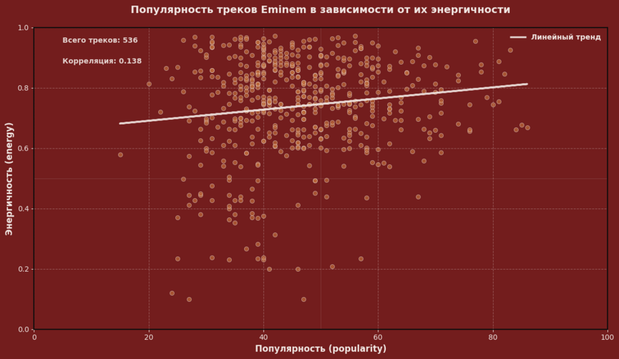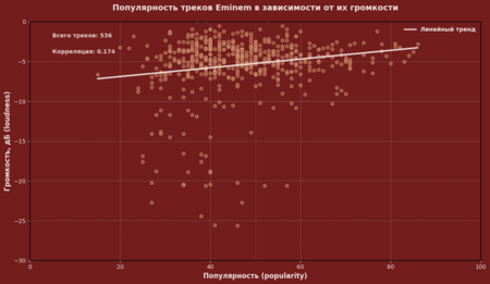 Можно заметить, что в самых популярных треках Эминема тренд прослеживается — показатели «Танцевальность» (кроме Mockingbird) и «Громкость» крайне высокие, в то время как «Энергичность» выше среднего. Показатели «Акустичность», «Живность» и «Фактор речи» почти везде крайне низкие.