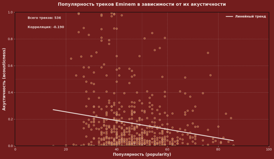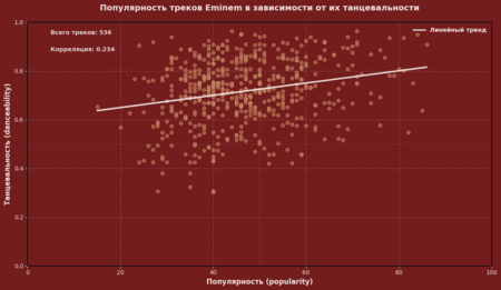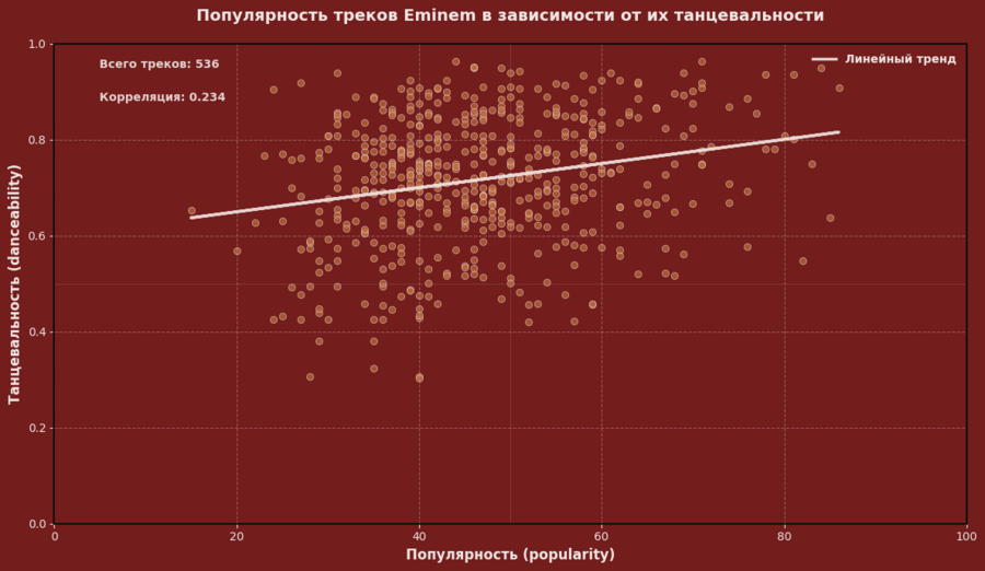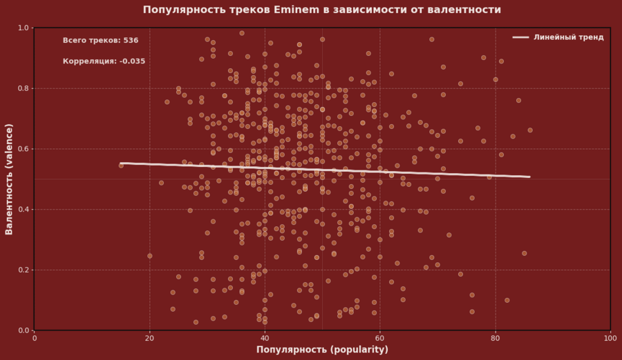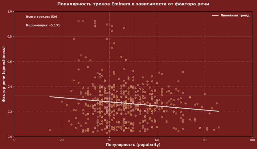 Эти результаты совпадают с выявленными тенденциями, что подтверждает теорию «формулы успеха» треков Эминема. Могу предположить, что исполнитель также провел подобный анализ своего творчества, ведь абсолютно все треки из его нового альбома впервые за всю его дискографию выше среднего по популярности.
