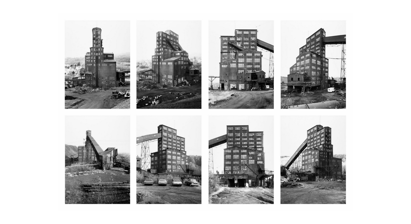 Типологии индустриальных объектов Бернда и Хиллы Бехер показывают не историю, а лишь серийность. Линейность заменена на принцип каталога, где значение возникает из сравнения одинаковых элементов, а не из их последовательности — деконструкция повествования в пользу архива.