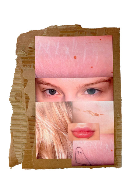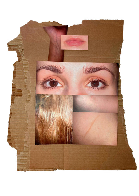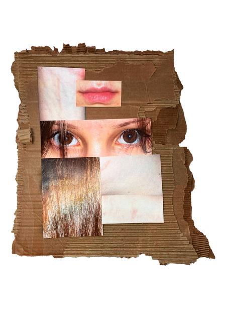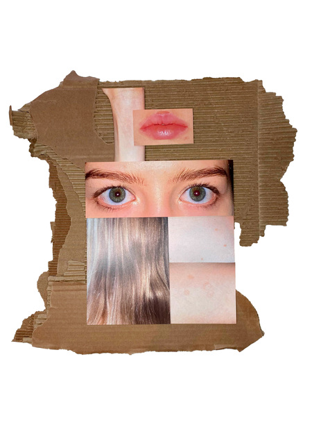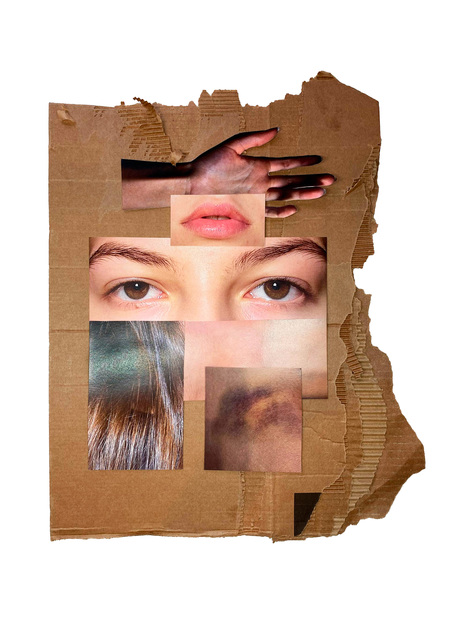 Здесь нет ретуши, видна настоящая текстура. Мне было интересно микроскопически рассмотреть человека, принимая и то, что считается эстетически привлекательным в обществе (глаза, волосы), и то, что обычно отталкивает (шрамы, синяки). Так, я создаю портрет человека в деталях. Образы размещены на разорванном картоне: материал расслаивается, поддерживая идею фрагментарности, внимания к деталям.