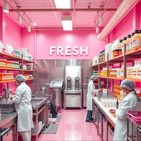 The interior of a vibrant pink-colored, sterile-looking laboratory with stainless steel surfaces, featuring three workers wearing masks, hairnets, and white lab coats. They appear to be working at various stations, possibly in a production or quality control setting. Shelves are filled with bottles and supplies. «FRESH» is boldly displayed on the back wall.