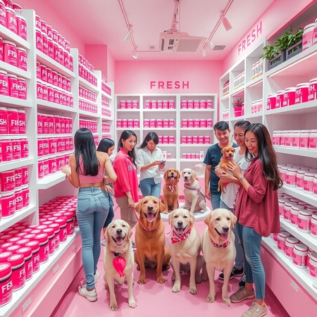 A brightly lit, monochromatic pink dog care store bustling with customers and various breeds of dogs. The shelves are stocked with pink containers labeled «FRESH». Several Asian people admire the products while some interact with the dogs. Some golden and white labradors are sitting obediently in the foreground, some are wearing bandanas with hearts as accessories. The word «FRESH» is prominently displayed on the back wall of the store.