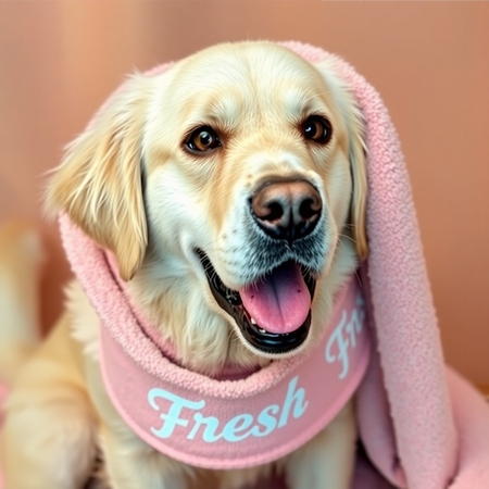 A happy white Labrador with a fluffy coat and a big smile is draped with a pink towel with «Fresh» printed on it. The dog’s tongue is sticking out, and it appears to be freshly cleaned, posing against a soft pink background.
