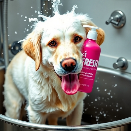 A realistically rendered, wet, and somewhat messy white Labrador stands in a stainless steel tub under a shower. Water droplets spray from its head. It holds a vibrant pink bottle of «Fresh» dog shampoo. The dog has its tongue out, looking cheerful. Plumbing fixtures are visible in the blurred background.