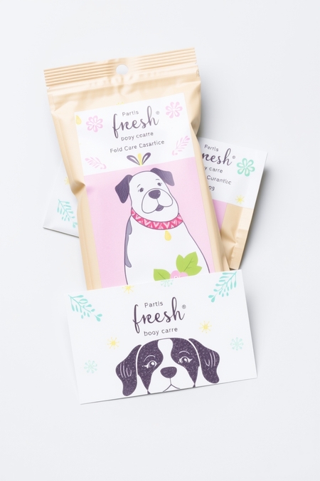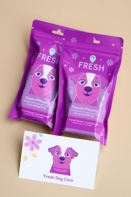 A product shot featuring two purple packets and a business card for «Fresh Dog Care» against a neutral background. The packets have an illustration of a cute pink dog and the word «FRESH» in bold, uppercase letters. the business card also features the dog logo and the company name: «Fresh Dog Care.»