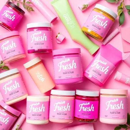 A vibrant and colorful flat lay arrangement of jars, tubes, and sticks of «Fresh» branded pet care products spread across a pink backdrop. The products are various shades of pink, with one green tube. The jars contain substances of different colors and textures. Sprigs of greenery and flowers are interspersed among the products.