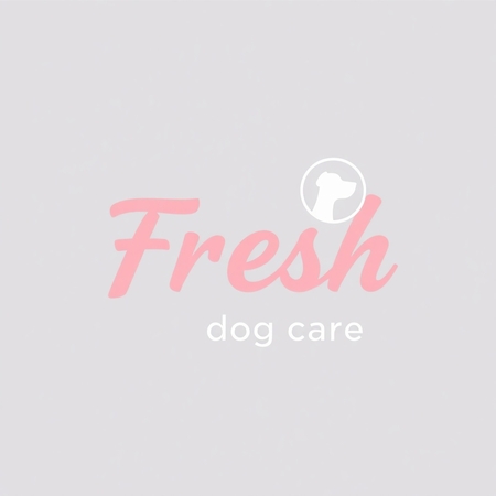 A stylized logo for the «Fresh dog care» brand. «Fresh» is written in a pink cursive font, above «dog care» in a smaller, simpler font. A white silhouette of a dog’s head facing right is inside a white circle, to the right of the «Fresh» text. The logo is set against a light grey background.