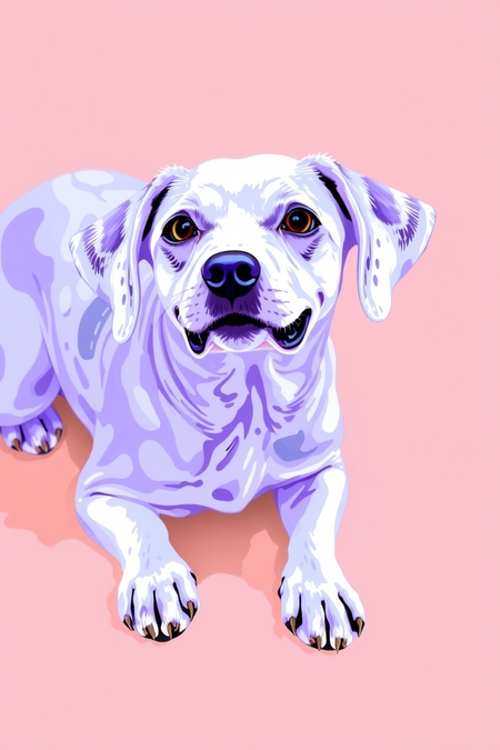 Использованный промпт для обложки A stylized illustration of a white dog with light purple shading to create depth, lying down against a pale pink background. The dog has dark brown eyes and small black spots on its body. The illustration has a clean, modern look with minimal detail.