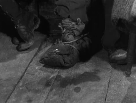 Автор делает акцент на вещах, которые предвещают будущие события. Главный герой видит, как к его жене пристает другой мужчина и встает, после чего зритель видит крупный кадр, где в его руках раскрывается нож. Намерения персонажа ясны и без слов.