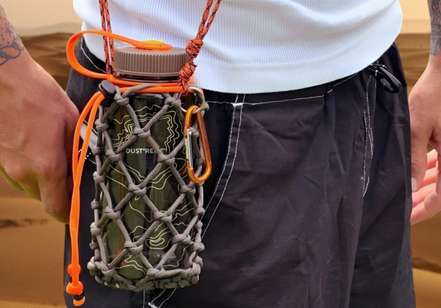 promt: a sports water bottle lies in the desert sand, with drops of water on it and the words DUST-REME written next to it, and motorcycle tire tracks