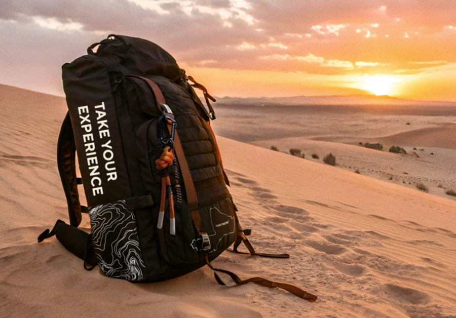 promt: a black hiking backpack is lying at sunset in the desert, wearing a carabiner with orange ropes, a pattern of desert drought and extreme, add a scuff effect to the backpack design, more orange elements and the DUST°REME inscription