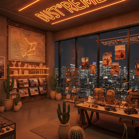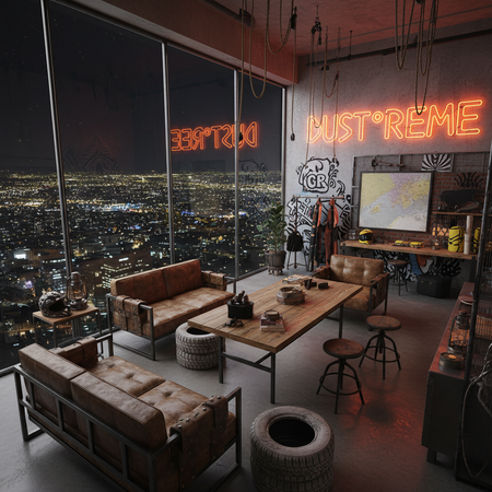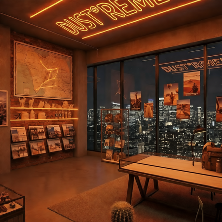 Генерация офисов DUST°REME' в разных городах. Все идеи объединяет неоново-оранжевая вывеска с названием и общий вайб пространства — бунтарский андеграунд. Нейросеть: Jay Flow, генерации проводились паутинкой на основе стиля логотипа с последовательными правками.