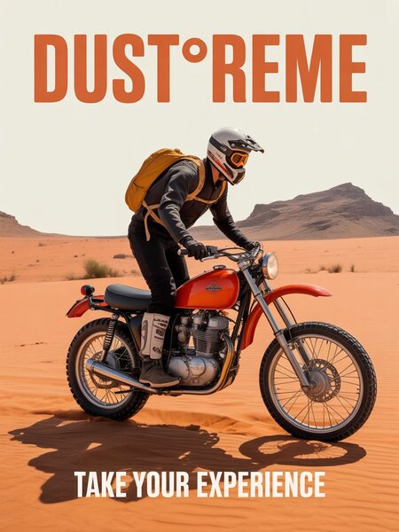 promt2: poster for an extreme desert travel agency DUST°REME', orange color, guy in motorcycle gear in the desert, shows a two-finger V gesture with his hands, slogan take your experience