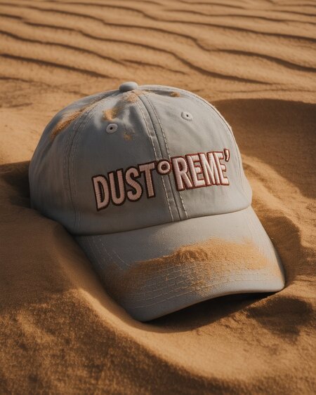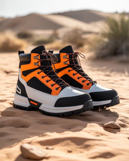 promt1: cap in the desert sand embroidered with the inscription DUST°REME' promt2: hiking shoes in the desert, similar to moto equipment, colors orange, black and white, sharp shapes