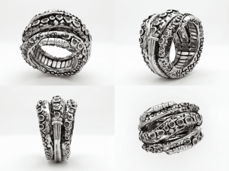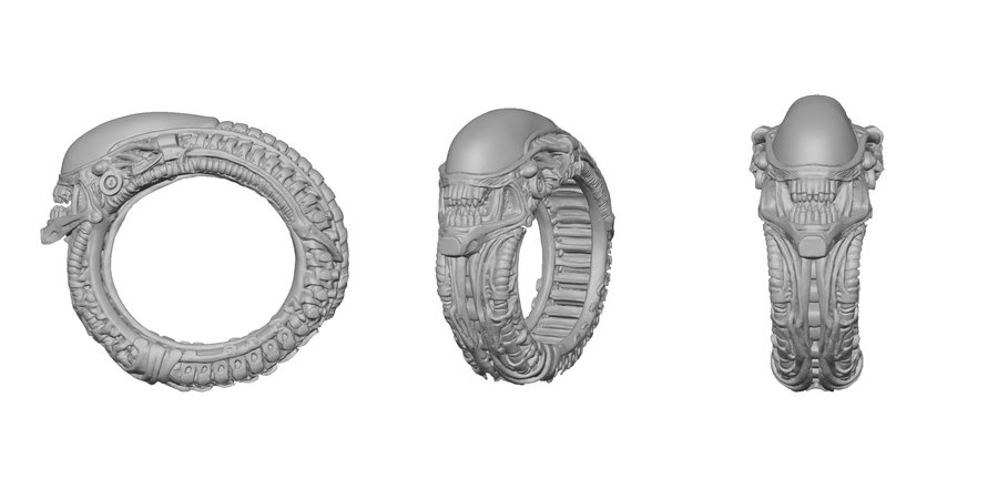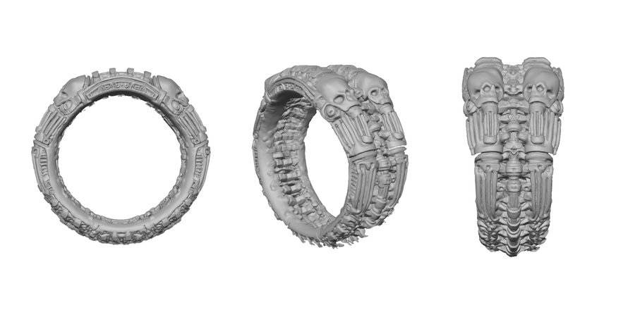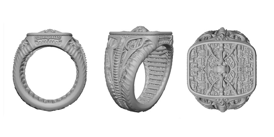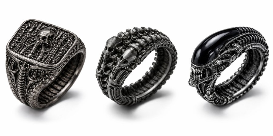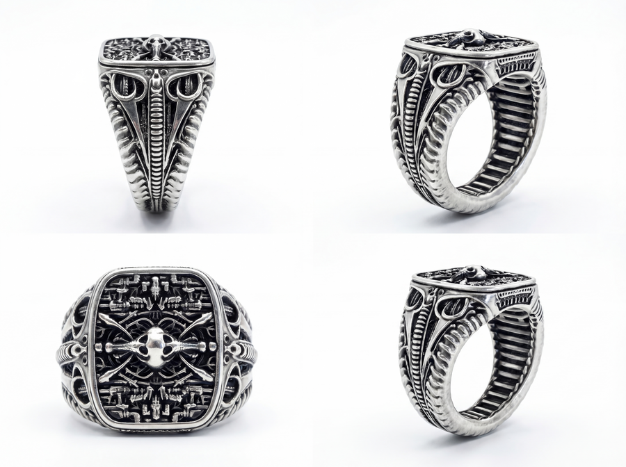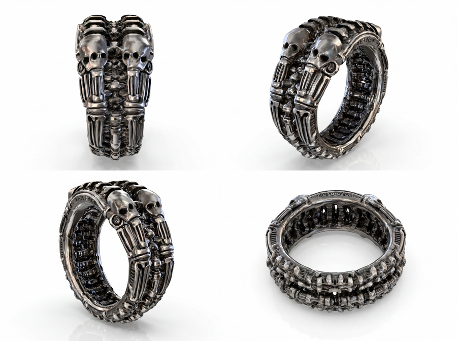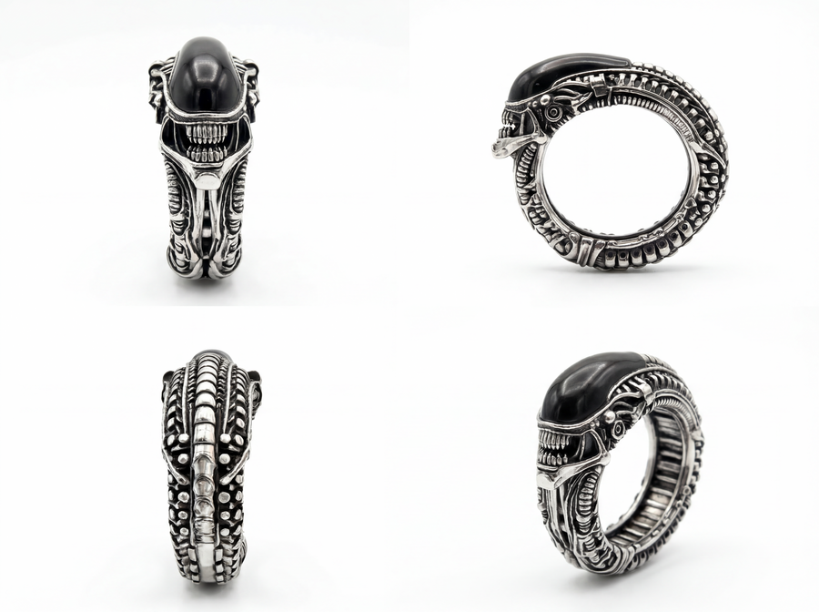 Каждое кольцо — это микроскульптура, воплощающая готическую элегантность биомеханического будущего, где красота рождается из синтеза плоти и стали, ужаса и восхищения.