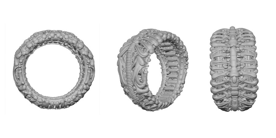 Кольца объединяет эстетика слияния биологических форм с индустриальными структурами — скелетные элементы переплетаются с металлическими деталями, создавая образ футуристической эволюции, где тело и машина становятся единым целым.
