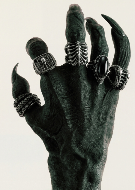 Biomechanical silver rings on demonic pale hand with claws, gothic skull and skeleton designs, black background, dramatic lighting, dark fantasy photography / NanoBanana