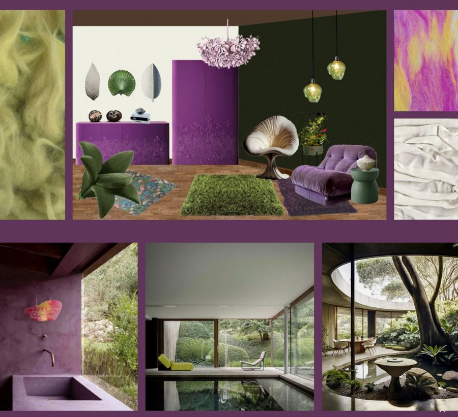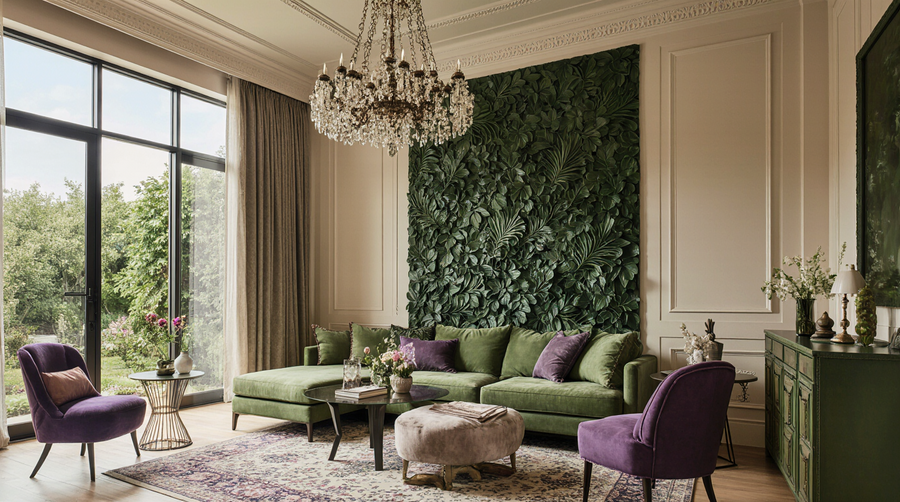 Промпт для интерьера: Realistically visualize a boutique hotel villa living room interior in a floral nature theme. All furniture should be designer: cabinets with bas-relief of plants, soft sofas in green and purple tones, wall decorations looking like leaves and flowers, intricate chandelier, persian rug in green beige and purple tones. Walls should be beige, one is dark green. Details and decoration should be on-theme and also imitate natural objects like leaves and flowers. And a beautiful view out of the floor to ceiling windows on the garden surrounding the villa.