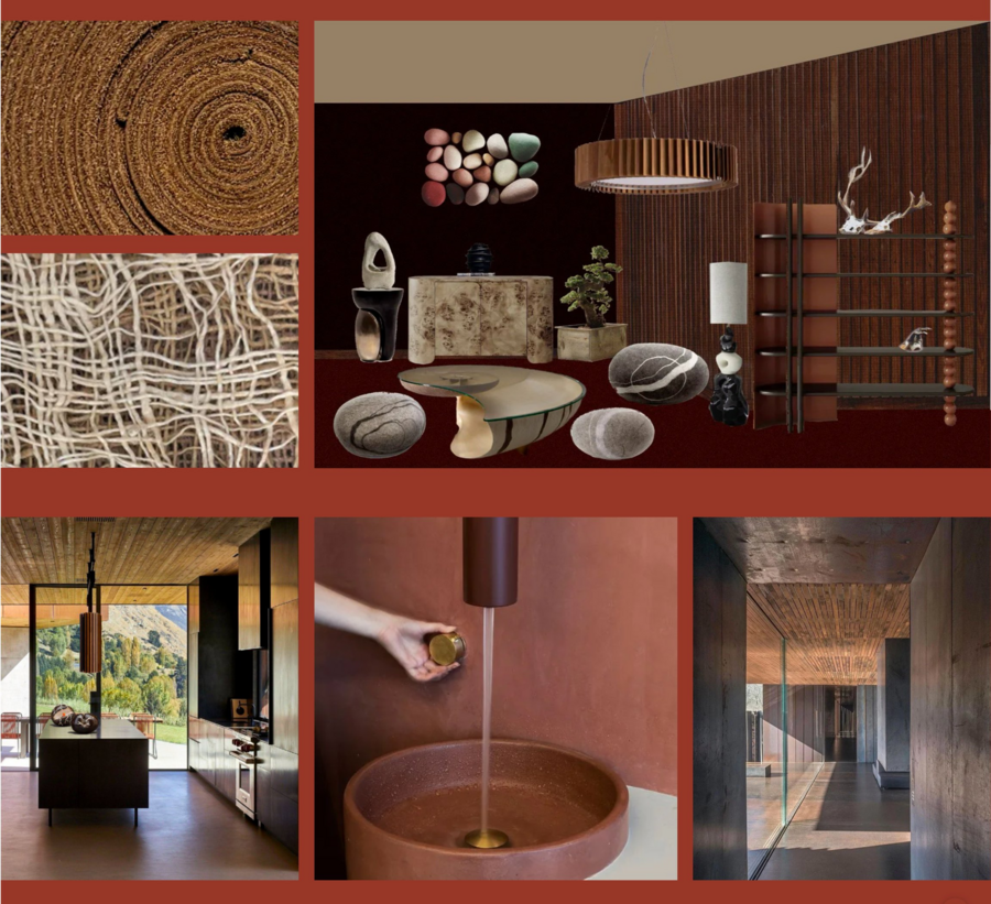Промпт для интерьера: Realistically visualize a boutique hotel villa living room interior in a earthly nature theme. All furniture should be designer: pouffes immitating rocks, wooden cabinet, dresser, chandelier, earthly toned sofas and shell inspired coffee table. Walls should be brown, one decorated with wooden planks. Details and decoration should be on-theme and also imitate natural objects like rock or wood. Floor is wooden, with a short pile rug. A beautiful bonsai tree in the corner of the room. And a scenic view out of the windows on the mountains.