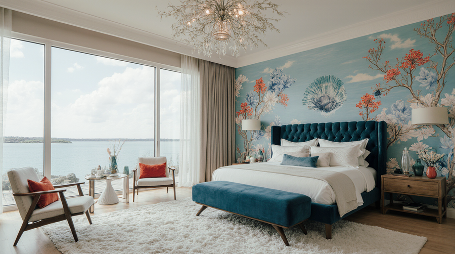 Промпт для интерьера: Realistically visualize a boutique hotel villa bedroom interior in a loft marine nature theme with chinese design influence. All furniture should be designer: blue textile bed frame, blue, green, red and clear vases in natural forms, relief dresser, coral wall decorations, designer light fixtures and shell chandelier, rug with long pile in sea blue and white colors, clear chairs, a sofa on-theme. Color scheme in all shades of sea blue and white with details of red accents. Walls should be beige, one is hand painted wallpaper inspired by chinese art, in light blue colors, with subtle natural ornaments. Details and decoration should be on-theme and also imitate sea themed natural objects like corals or shells. And a beautiful view out of the floor to ceiling windows on the lake in front of the one story villa.