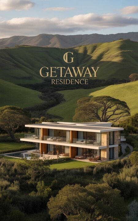Промпт для постеров (снаружи): Сreate an advertizing image for a luxurious boutique hotel surrounded by nature. Show a scenic landscape in a realistic way with a designer architectural two story villa in the center. Add the hotel’s name «Getaway Residence» on the image.