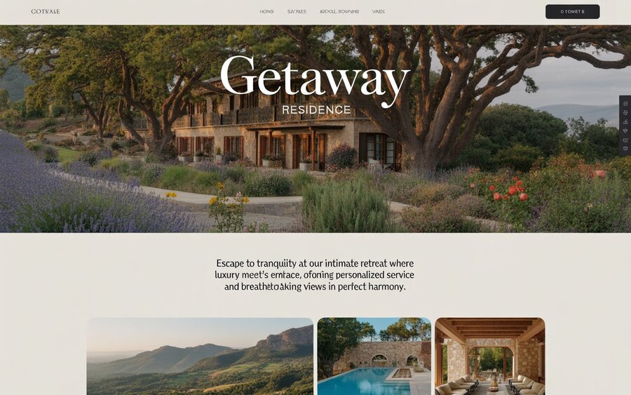 Промпт для страницы сайта: Create an advertizing website home screen for a luxurious boutique hotel surrounded by nature. Add realistic images of green gardens with flowers, landscapes and details of the hotel. and Add the hotel’s name «Getaway Residence» on the top and add a small discriptive text of the hotel.