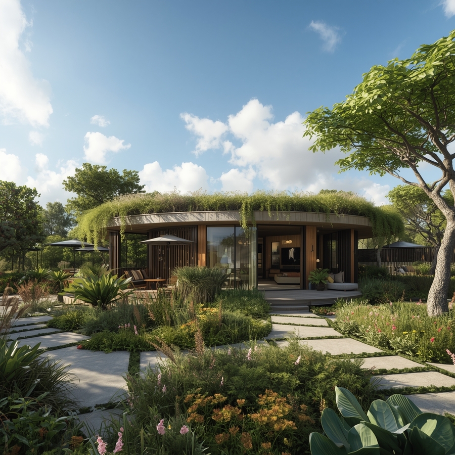 Промпт для экстерьера: Realistically visualize a modern designer one story circular boutique hotel villa surrounded by a garden and nature.