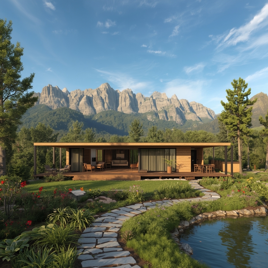 Промпт для экстерьера: Realistically visualize a modern designer one story boutique hotel in earthly theme surrounded by nature with a scenic mountains view.
