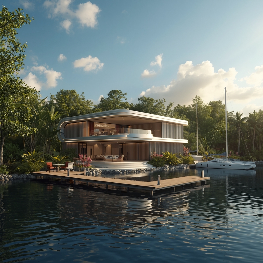 Промпт для экстерьера: Realistically visualize a modern designer two story boutique hotel in marine theme near the river surrounded by forest.