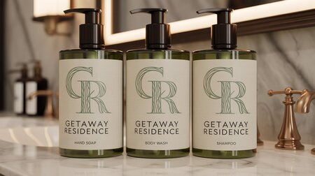 Промпт для баночек: Realistically visualize a set of bathroom soap bottles for a luxurious boutique hotel with the hotel’s branding. Label should include the name of the hotel, the logo and the names of products inside the bottles. What shouldeach bottle label design include: A minimalist monogram logo featuring the intertwined letters «G» and «R» rendered in elegant, flowing typography with organic curves that evoke natural forms like tree branches or flowing water. The letterforms are crafted in a warm sage green color, with subtle texture reminiscent of natural linen or handmade paper. Below the monogram, «Getaway Residence» appears in clean, understated sans-serif lettering in a complementary earth tone. The design is set against a soft cream background with plenty of white space, creating a sense of tranquility and sophistication that reflects the boutique hotel’s connection to nature and peaceful retreat atmosphere.