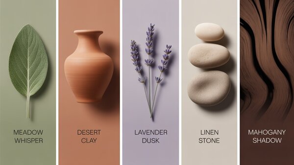 Промпт для палитры: Create a color palette for a luxurious boutique hotel. It should consist of earthly tones like warm sage green, terracotta, flowery purple, beige and dark brown. Visualize the palette as icons of natural objects corresponding to the colors they are filled with. Create a name for each color in the palette.