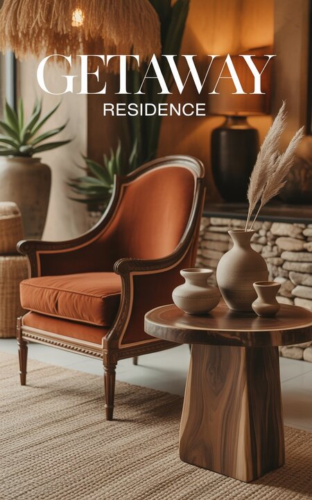 Промпты для интерьерных постеров: Create an advertizing image for a luxurious boutique hotel. Show a set designed close up shot of room interior designer piece in earthly theme. Add the hotel’s name «Getaway Residence» on the image.
