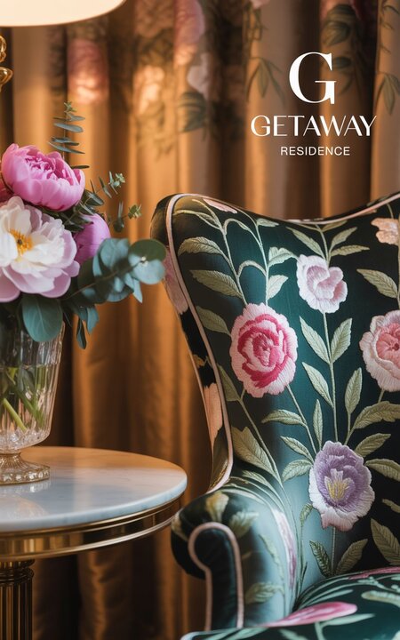 Create an advertizing image for a luxurious boutique hotel. Show a set designed close up shot of room interior designer piece in floral (nature) theme. Color scheme is dark green, beige and light purple and pink. Add the hotel’s name «Getaway Residence» on the image.