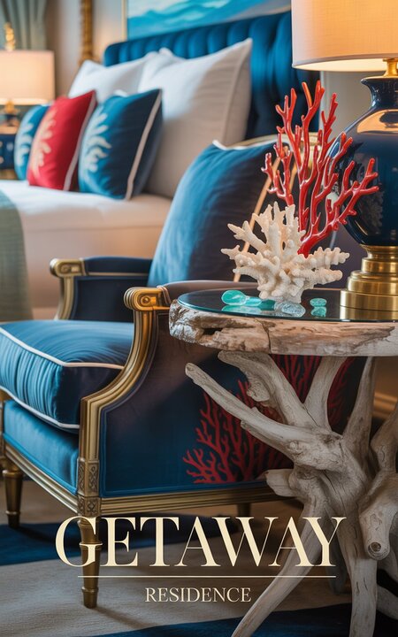 Create an advertizing image for a luxurious boutique hotel. Show a set designed close up shot of room interior designer piece in marine theme. Color scheme is different sea shades of blue, beige, and a little bit of scarlet. Add the hotel’s name «Getaway Residence» on the image.
