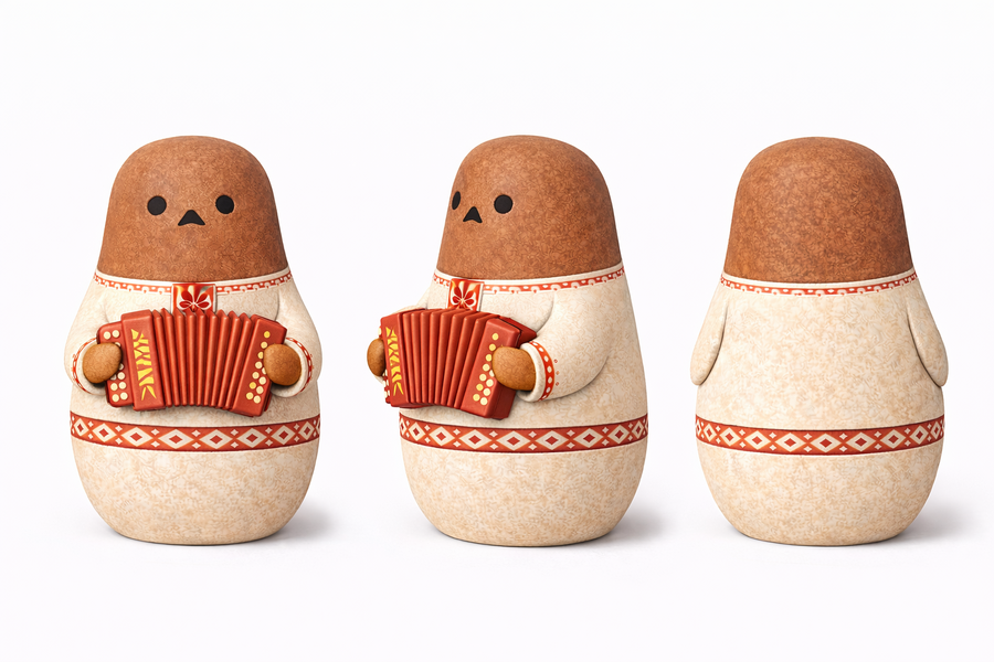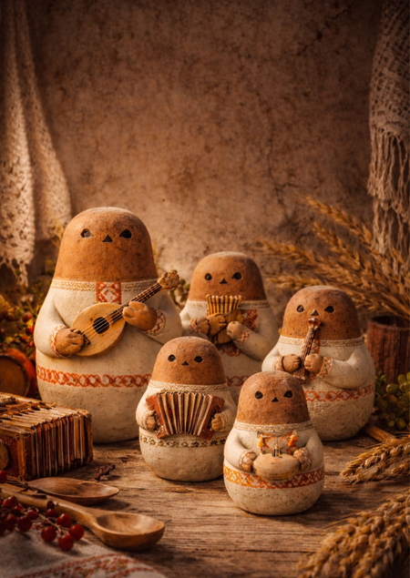 Серия построена как единый ансамбль объектов, где каждый персонаж представляет отдельный музыкальный тембр и роль, а вместе они формируют цельную композицию — визуальный аналог фольклорного ансамбля.